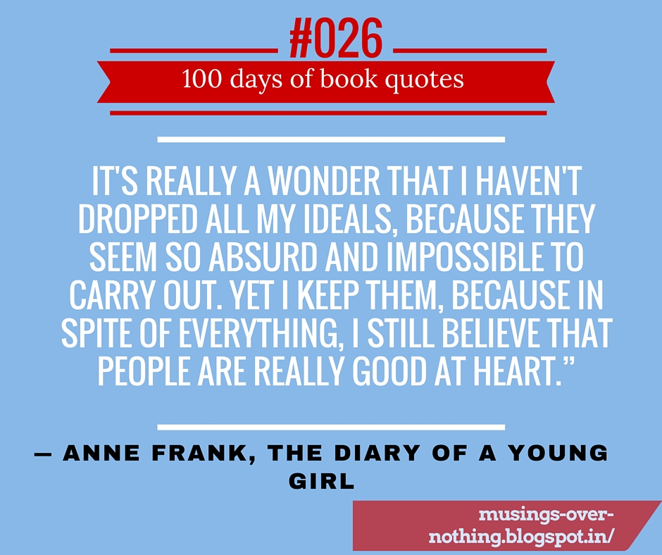 It’s really a wonder that I haven’t dropped all my ideals, because they seem so absurd and impossible to carry out. Yet I keep them, because in spite of everything, I still believe that people are really good at heart.” ― Anne Frank, The Diary of a Young Girl